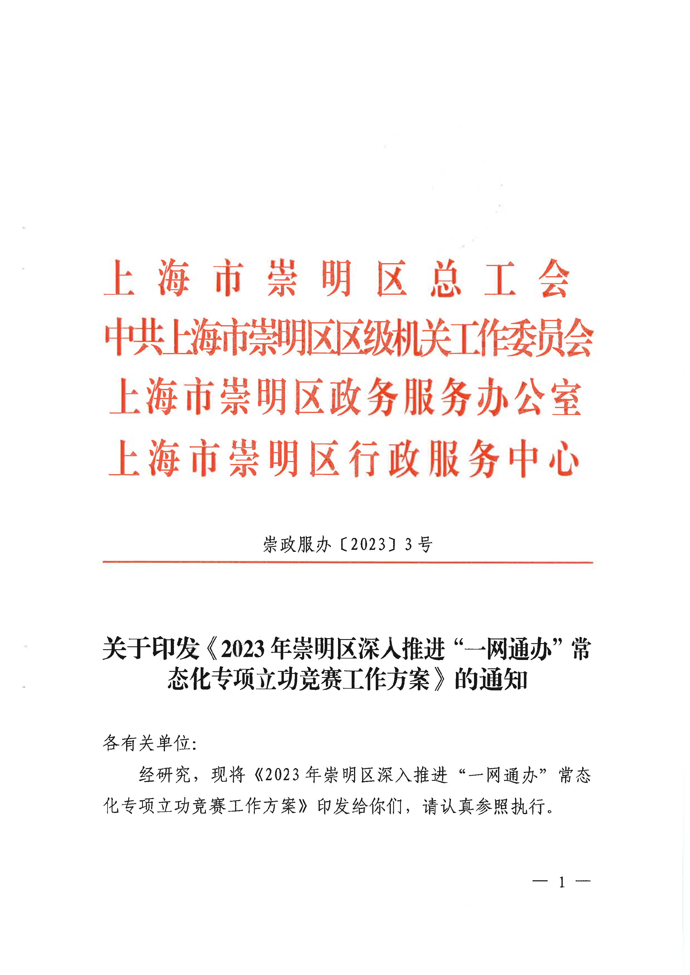 经研究,现将《2023年崇明区深入推进“一网通办”常态化专项立功竞赛工作方案》印发给你们,请认真参照执行。