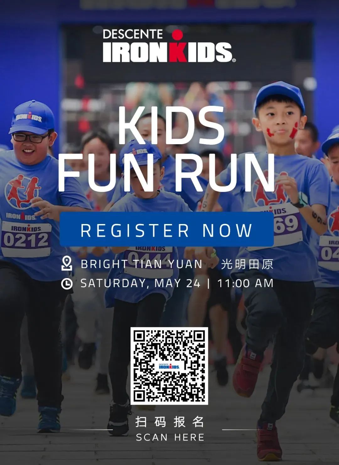 Registration is now open for DESCENTE IRONKIDS Shanghai, Chongming, set for May 24 and featuring a 500m run for ages 3-6 and a 1,000m run for ages 7-12.