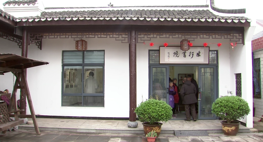 “米行书院”位于米行村第二网格点,长廊的墙面两边分别布置了米行村的村史村情和书画展示,图文并茂地展示了老米行人的故事。走进“米行书院”,笔墨纸砚一应俱全,在这里,书法爱好者可以尽情挥毫泼墨,将村庄的故事化作笔尖的墨韵。如今,这座由村闲置房屋改造的文化空间,已成为新时代乡村振兴的文化地标。一位书法爱好者介绍,经常有市民游客来这里写写书法,氛围很好。