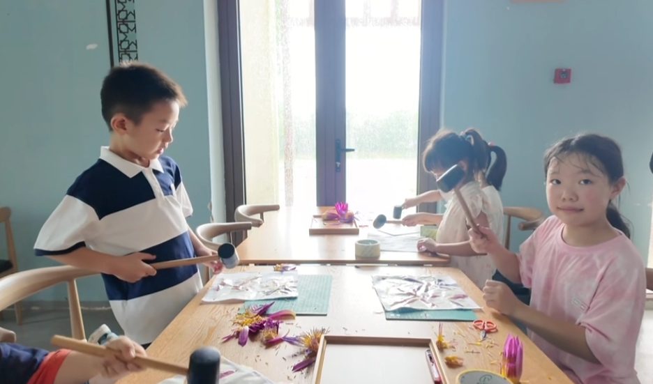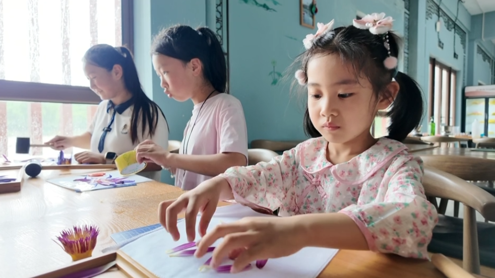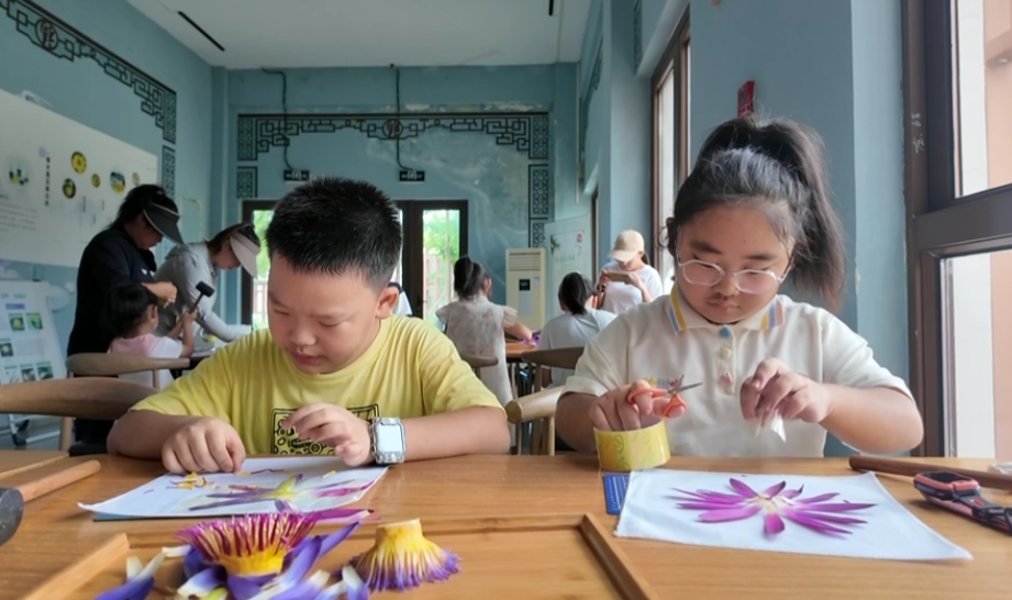 随后,工作人员带领小朋友们用采摘的莲花拓印。将花瓣采下,在白色手帕上排成喜欢的图案,用胶带封贴后,再用橡皮锤敲击片刻,让花瓣汁液渗入手帕。撕下胶带,一方素雅的莲花手帕就做成了。 “孩子暑假在家基本就是玩平板电脑、手机,出来见见大自然非常好。”一位家长说。