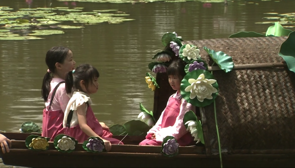 “好玩!我采了很多好看的莲花。”“莲花很好看,我要带回家送给外婆和妈妈。”孩子们都很开心。采累了,就坐上乌篷船,在莲塘内泛舟休憩,静赏园内美景。