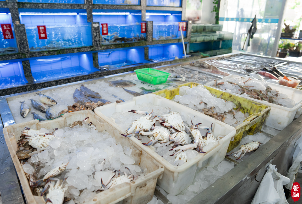 这边还忙着卸货,那边渔港码头的海鲜超市已经将最新鲜的梭子蟹、竹节虾、条虾上架,摆上了最显眼的位置。