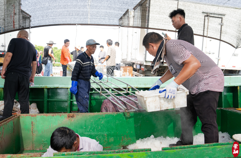海鲜上岸后,早早等候的收购商们抓紧验货,随即迅速装车运送出港,抢占第一波市场。