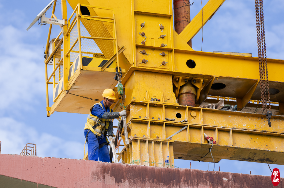 早晨七点多,运梁车载着重达740吨的第143榀梁,从东平预制梁场出发,沿着已经架设完成的崇明特大桥,缓缓驶向架梁现场。黄色的巨型架桥机宛如一头钢铁巨兽,匍匐在施工点位上。运梁车抵达后,先向架桥机“喂梁”,架桥机携梁缓行,运梁车退出,梁到达155、156号墩位后,横移装置微调对准下方桥墩垫石,再借助精密的测量系统引导、机械微调等,实现精准落梁,数百吨的庞然大物最终以毫米级的精度平稳就位。整个架设过程持续约一个半小时,施工人员随后进行接缝浇筑与梁体固定作业。