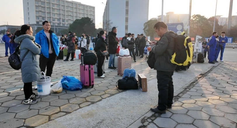 早上7点,晨曦微露,江南造船停车场内一派热闹温馨的景象,数辆“返乡直通车”整齐排列,返乡职工们拎着行囊,脸上洋溢着归乡的喜悦,大家在休息区域内有序等候大巴发车。