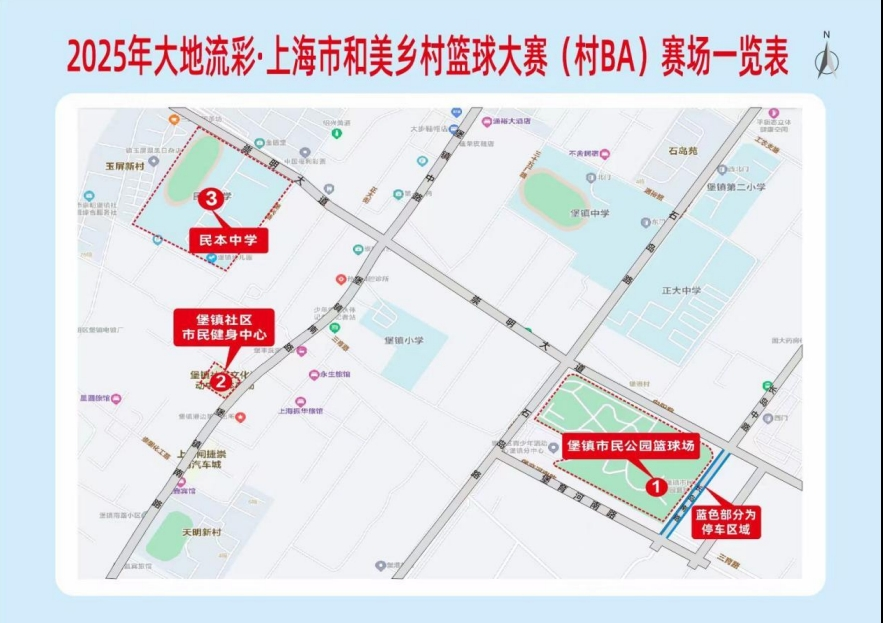 3.民本中学篮球馆为备用场地,如遇到下雨天,则将堡镇市民公园篮球场改至民本中学篮球馆,校内有停车场。