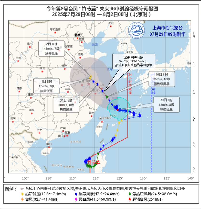 今年第8号台风“竹节草”(热带风暴级)今天(7月29日)08时位于浙江省舟山市东南方向约395公里的海面上,七级风圈半径200-300公里,“竹节草”将以每小时10-15公里的速度向西北方向移动,强度缓慢增强。预计“竹节草”明天(7月30日)白天在浙江舟山到宁波沿海登陆(热带风暴到强热带风暴级,23-25米/秒),较大可能在本市奉贤区到浦东新区南部一带二次登陆(明天傍晚到夜间)。“竹节草”移动缓慢,有近海加强过程,水汽充沛,预计对本区雨影响大于风。