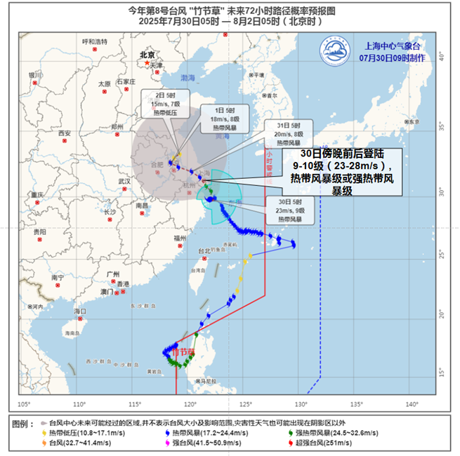 今年第8号台风“竹节草”(强热带风暴级)已于今天(30日)04时30分在浙江舟山朱家尖岛登陆,登陆时中心附近最大风力9级(23米/秒,热带风暴级),中心最低气压为975百帕。09时位于距离浦东南汇嘴东南方向约92公里的海面上,七级风圈半径100-300公里,将以每小时10-15公里的速度向北偏西方向移动,强度维持或略有加强。