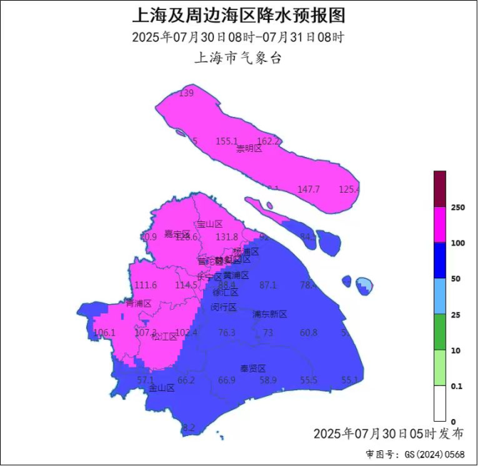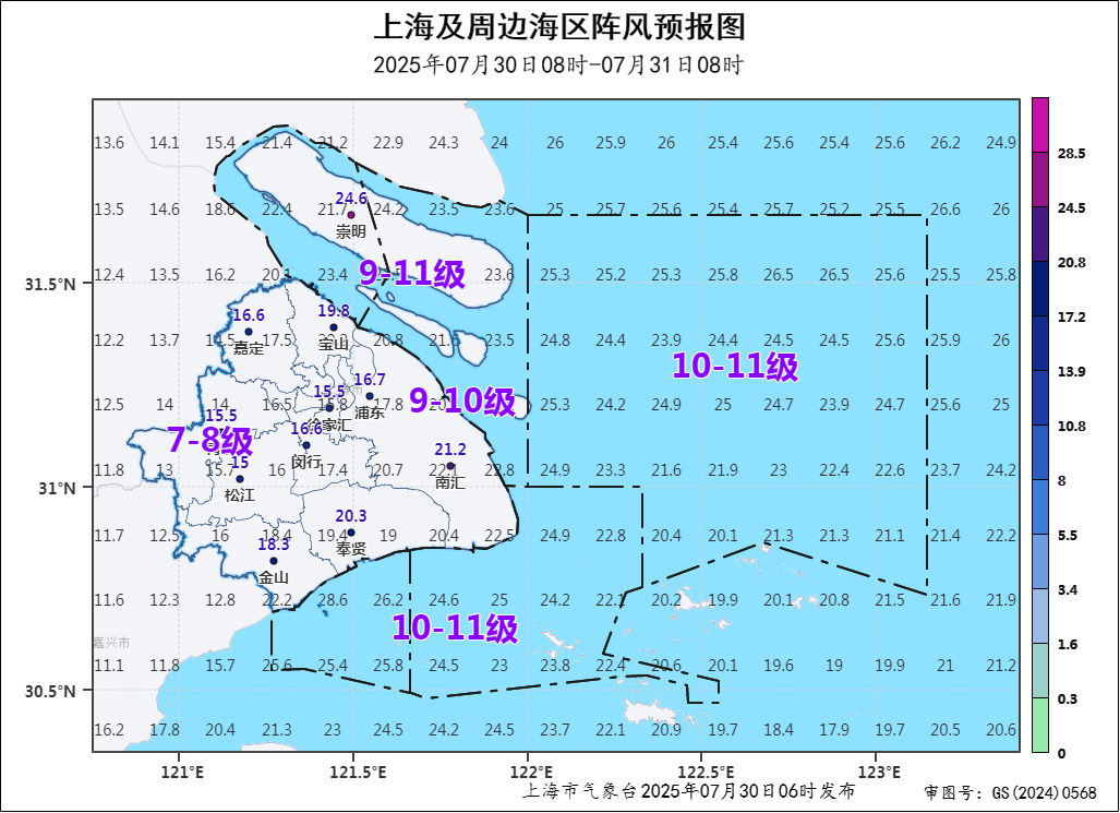 7月29日20时到30日09时00分实况,本区普降小到中雨,局部地区雨量达大雨,其中长兴郊野公园站41.6毫米为最大,横沙富民站36.7毫米次之,1小时雨量最大出现在长兴郊野公园站24.1毫米(30日05时20分~06时20分);本岛中西部乡镇出现6-7级阵风,东部乡镇、长兴、横沙出现8-9级阵风,长江口区出现10级阵风(24.7米/秒,长江口站)。