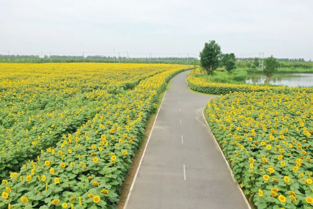 在光明田原,你可以看到一望无际的生态林地以及清澈水域,感受四季变幻的色彩。眼下正值向日葵盛花期,成千上万株向日葵交织成无边无际的金色海洋。