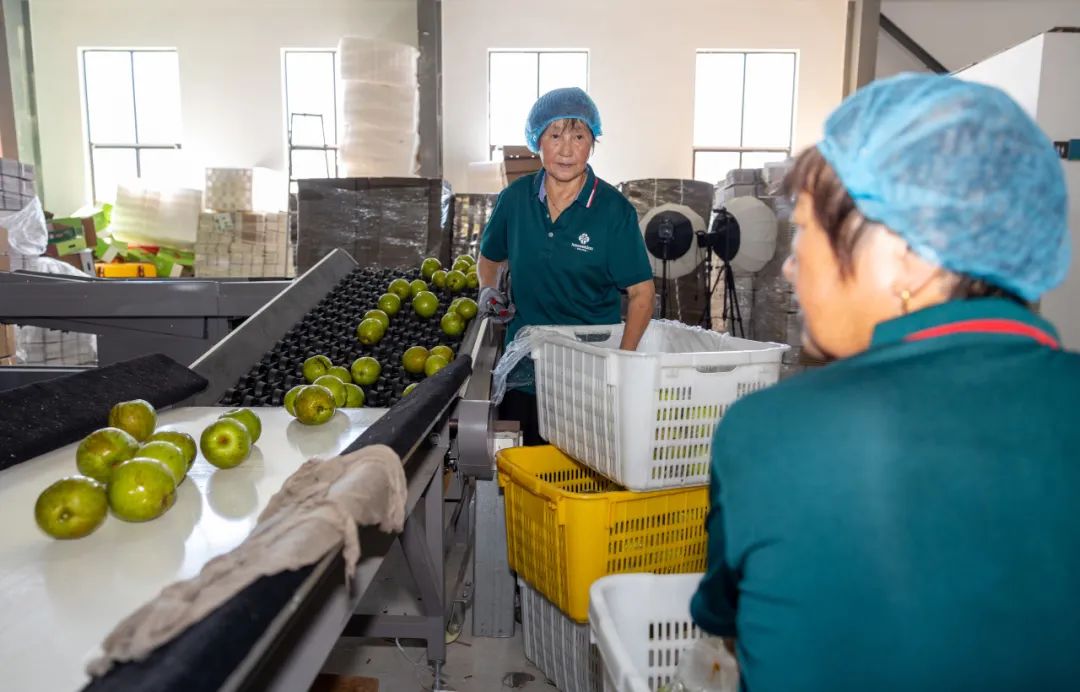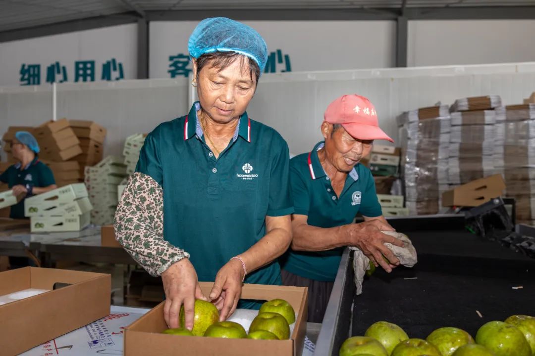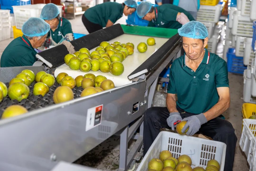 分拣车间内,工人们将经过初筛的翠冠梨放上自动分拣流水线,按照5两、6两、7两、8两不同规格,翠冠梨好像搭上一列小火车,到达符合各自大小的“区间站”后就会自动“下车”。