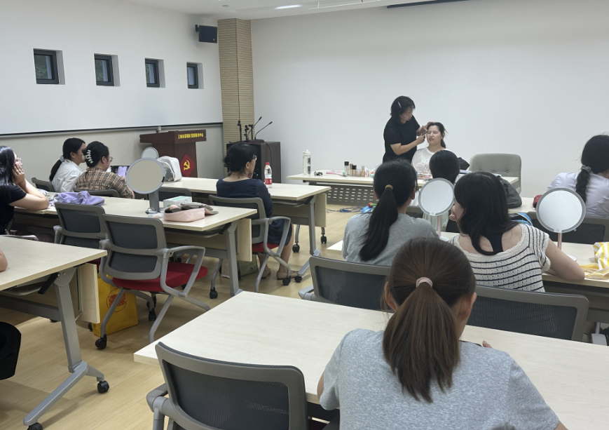 另一间教室内,个人形象美妆课同样备受青睐,授课老师吴悦正在为学员讲解化妆基础知识,大家聚精会神地观摩老师的化妆手法和技巧,并提出疑问。“老师很专业,每堂课都有特定主题和适用场景,10分钟讲解理论知识,然后再挑选一名学员做模特,最后让大家自己上手尝试,能够‘即学即用’。”学员顾睿洁说。