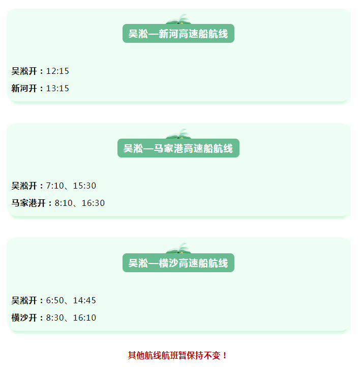 记者从上海客轮公司了解到,2026年1月7日至2月28日,上海客轮公司高速船实行冬季航班计划,调整后的航班时刻如下,其他航线航班暂保持不变,请各位旅客相互转告。当天开航情况可关注“上海客轮”微信公众号实时信息,或拨打问询电话69693666,以免耽误您的行程。