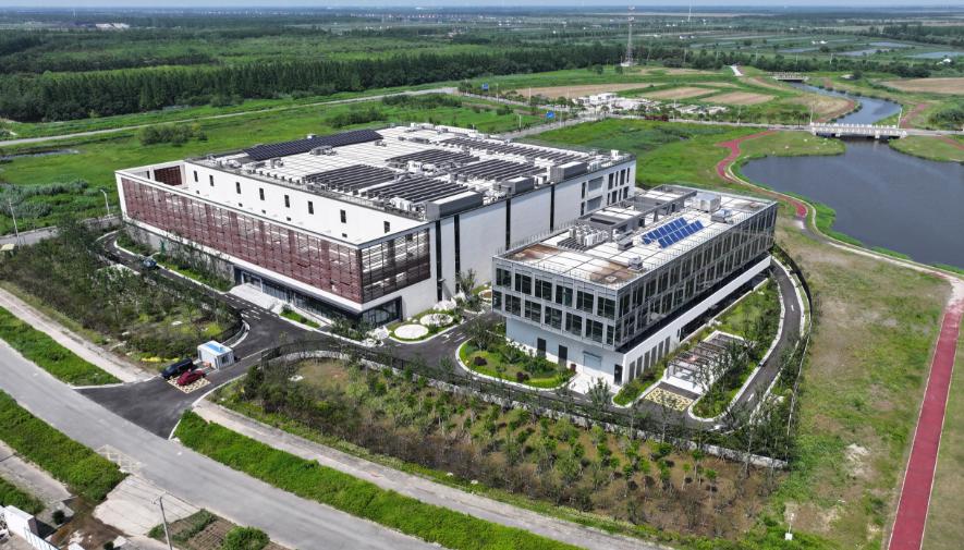 从空中俯瞰,上海智算中心建筑立方绿树环绕,环境优美,建筑风貌体现“中国元素、江南韵味、海岛特色”,外墙面采用雕刻回纹铝扣板和陶土砖,秦砖汉瓦镶嵌其中,尽显古典之美;研发办公楼及智算中心公共区域屋顶安装太阳能光伏板和下沉式绿地雨水收集系统,人工景观湖近在咫尺,建筑风格与自然环境协调,彰显生态与科技完美融合。