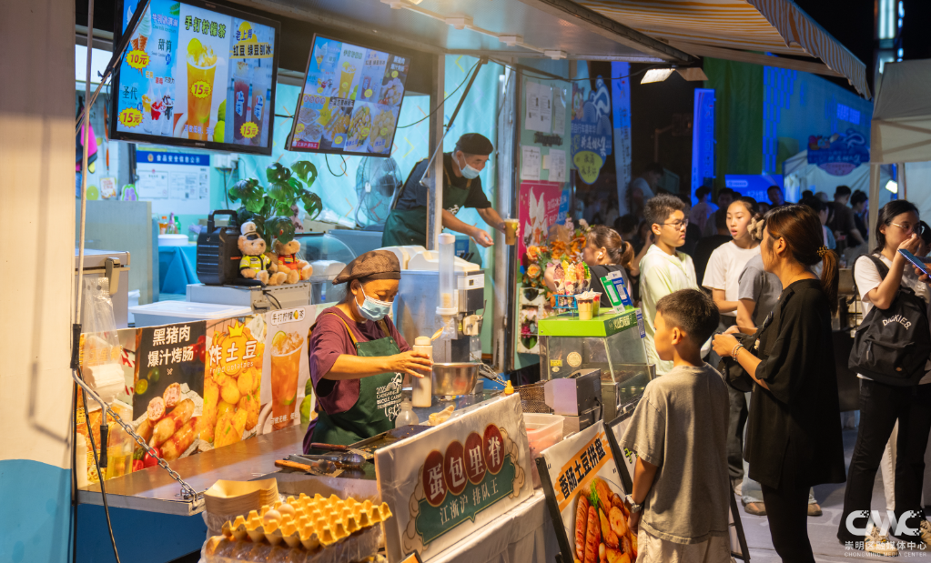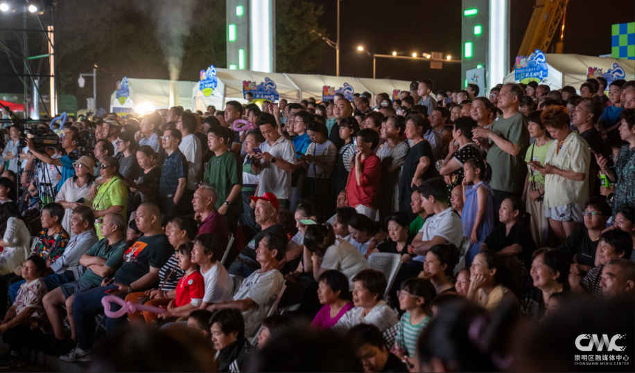 傍晚时分,凉风习习,新城公园内已是人头攒动,不少市民提前1小时带着家人孩子前来占位,享受嘉年华的欢乐时光。文艺表演在舞蹈《灯火里的中国》中拉开帷幕,随后女声独唱、笛子独奏、小品轮番登场,还有极具崇明特色的崇明评话与沪剧对唱,展现了本土文化的浓厚魅力。在活动的市集上,孩子们举着棉花糖穿梭在市集间,市民们品尝着飞饼、冰淇淋等特色美食,套圈游戏前更是排起长队,大家的脸上洋溢着幸福的笑容。