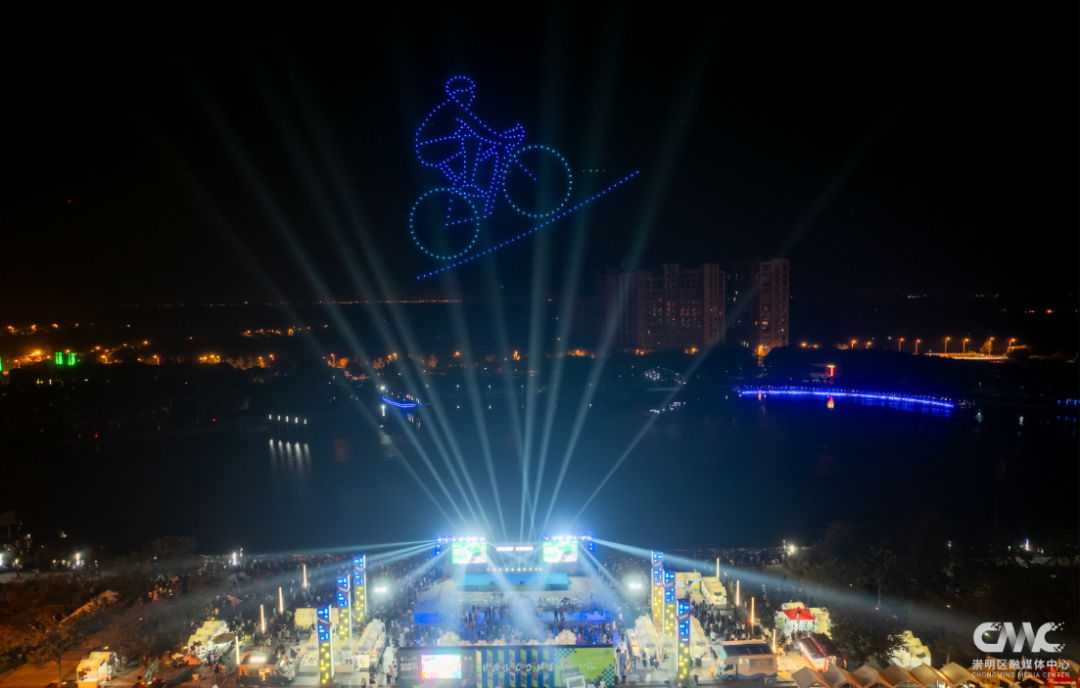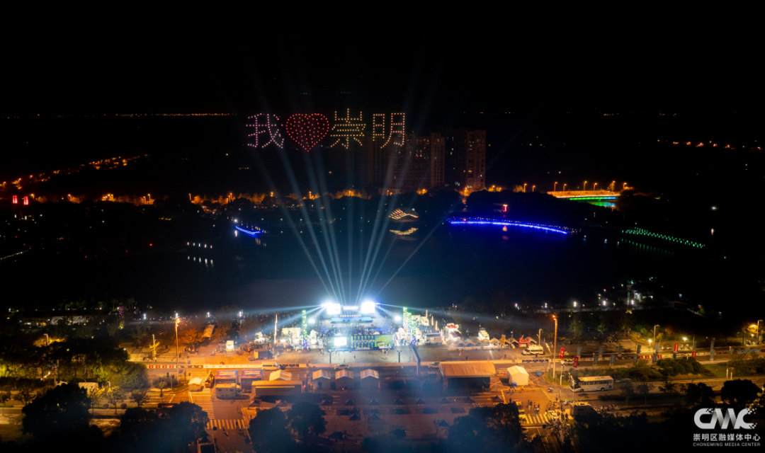 当晚,最引人注目的则是无人机表演。300架无人机缓缓升空,以“骑遇美好 悠哉崇明”为主题,在夜空中璀璨耀眼,变换着不同的图案。先是勾勒出崇明岛的生态轮廓,随后转为“崇明乡村文化旅游节”字样,接着凝结成本届嘉年华专属图标,当“我爱崇明”四个大字点亮夜空时,现场气氛达到高潮。